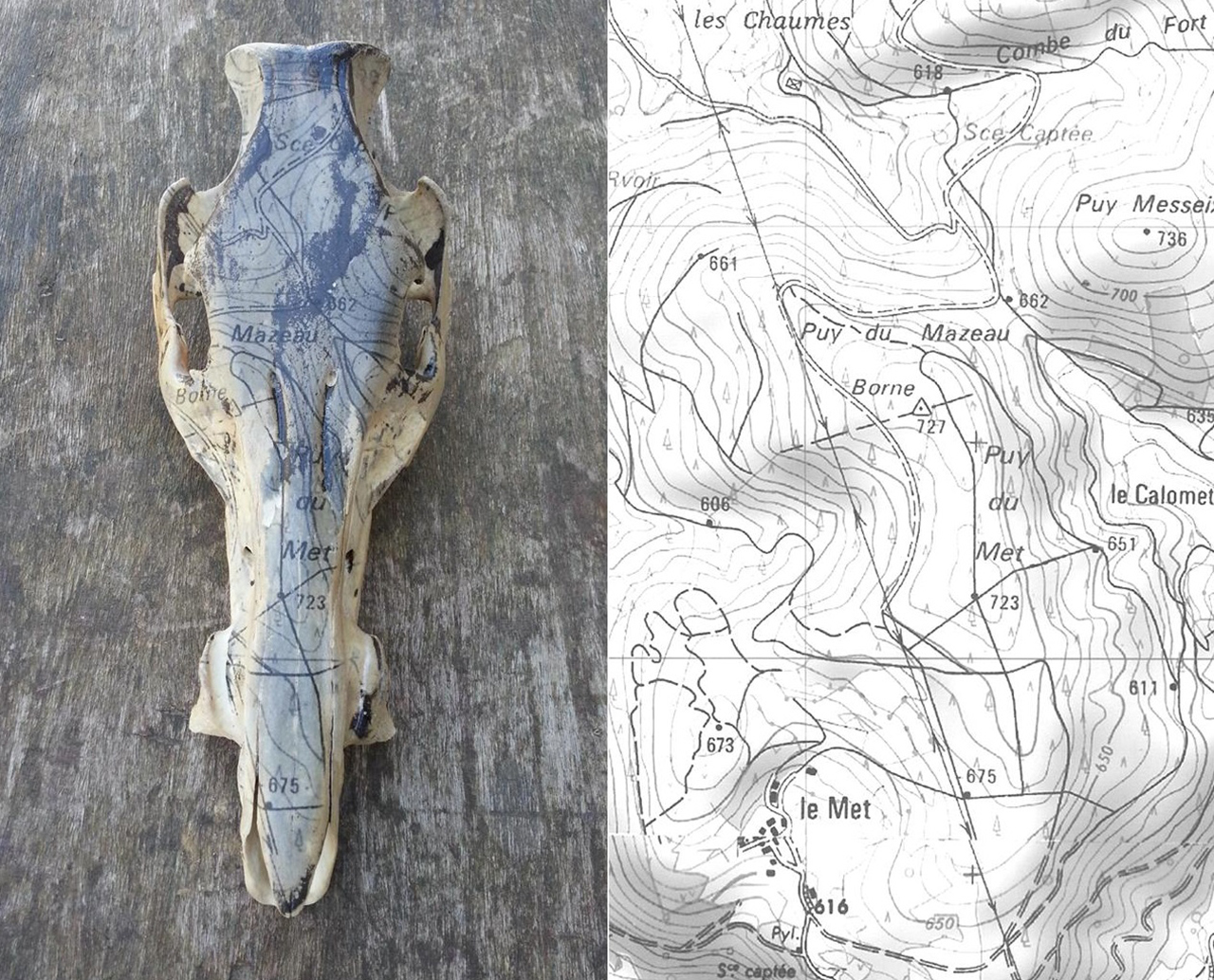 Following the cervids, a second series of works focuses on the wild boar, whose name, from medieval latin singularis, characterizes this solitary animal. It is also an animal of its land, its hold being made visible by its paths, wallows, and marked trees left behind. These paths sometimes intersect those of the hunter. This intersection is then transferred to the boar who will be given the topography of this interaction. The skull, which is first treated with pork gelatine and photographic emulsion, is then imprinted through a photographic process with the cartography of the place where the animal lived and was killed.