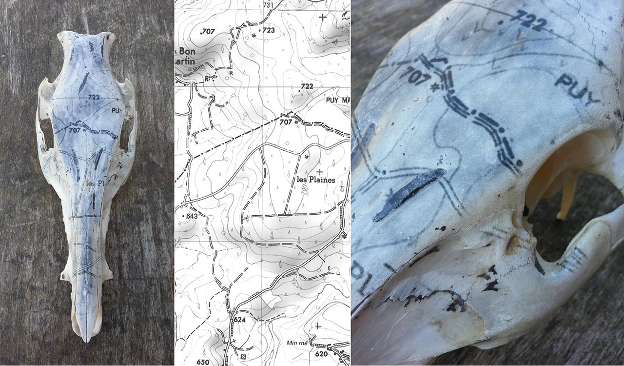 Photoprint on boneLiving and killing place cartography of a male boar (Sus scrofa) on its skull (length : 36,5 cm) - April 2013