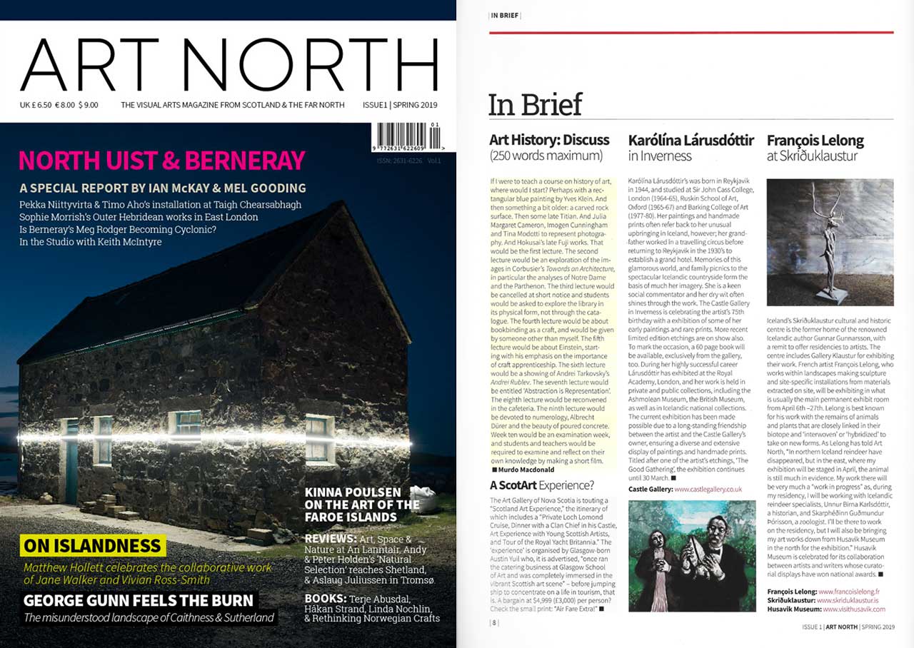 Art North, magazine d’art contemporain d’Ecosse et du Grand Nord (printemps 2019) (territoires scandinaves, baltes, nordiques, arctiques et canadiens) : version papier et actualité en ligne.
